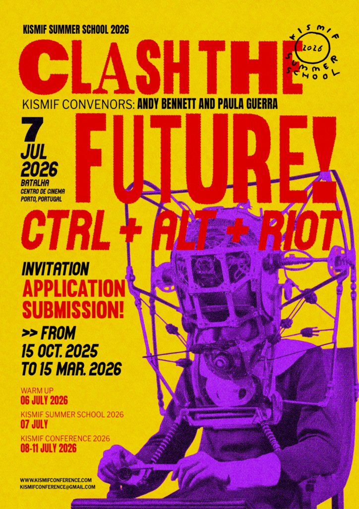 A Conferência KISMIF 2026 será antecedida por uma Escola de Verão intitulada “Clash the future! CTRL + ALT + RIOT”, que terá lugar a 7 de julho de 2026, no Batalha Centro de Cinema [Batalha Centre for Cinema]. Esta Escola de Verão oferecerá a todos/as os/as participantes, incluindo os/as congressistas, a oportunidade de frequentar oficinas ministradas por especialistas em diferentes áreas — incluindo a imaginação crítica, entre outras. As informações sobre a Escola de Verão serão divulgadas progressivamente no site da KISMIF Conference: www.kismifconference.com. O objetivo deste programa de um dia é promover a discussão sobre a intensificação da policrise que caracteriza a conjuntura global contemporânea — envolvendo autoritarismo político, degradação ambiental, instabilidade económica, migração forçada e a plataformização digital da vida social — destacando, em paralelo, as culturas DIY e a imaginação crítica como forças centrais para a mudança social.
